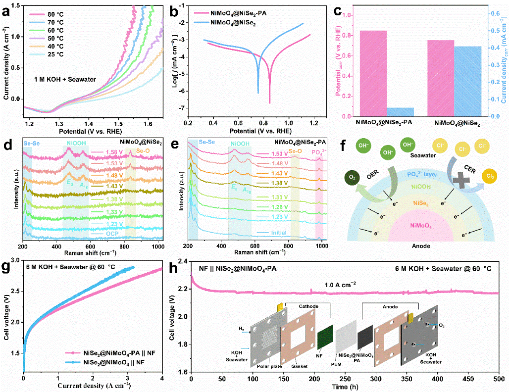 针对这一难题,本研究采用了一种表面工程策略,使用植酸(PA)作为分子“盔甲”来构建高度耐用的析氧反应OER催化剂。材料表征和密度泛函理论(DFT)计算表明,PO43−基团对表面进行修饰不仅有利于表面重建形成NiOOH活性位点,而且优化了关键反应中间体的吸附-解吸动力学,从而提高了催化剂的性能。重要的是,PO43−层抑制了活性位点对氯离子的吸附,显著提高了在恶劣海水条件下的耐腐蚀性。因此,催化剂在碱性海水中以208 mV的低过电位提供100 mA cm-2的电流密度,并在1500小时内保持稳定的性能。当作为阳极催化剂用于膜电极电解槽时,它支持在1 A cm-2的电流密度下运行,电池电压仅为2.18 V,并在500小时内没有表现出性能退化。这项工作不仅解决了硒化物电氧化过程中的金属溶解问题,还为合理设计高活性、抗腐蚀工业级海水电解催化剂提供了一种简明而有效的策略。