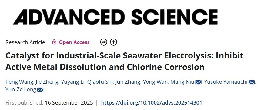 龙云泽课题组联合澳大利亚昆士兰大学Yusuke Yamauchi教授、我校纺织学院郑杰博士、我校材料学院牛莽博士在国际著名期刊《Advanced Science》(2025, e14301)上发表了题为“Catalyst for industrial-scale seawater electrolysis: Inhibit active metal dissolution and chlorine corrosion”(工业级海水电解催化剂:抑制活性金属溶解和氯腐蚀)的研究论文。《Advanced Science》(先进科学)最新SCI 影响因子为14.1。论文第一作者为博士研究生王蓬和青年教师郑杰博士,通讯作者为青岛大学牛莽博士、龙云泽教授与昆士兰大学Yusuke Yamauchi教授。