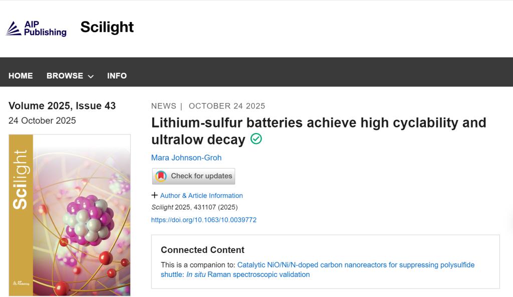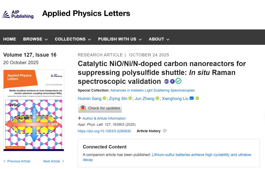刘相红教授团队在自然指数期刊Applied Physics Letters发表题为“Catalytic NiO/Ni/N-Doped Carbon Nanoreactors for Suppressing Polysulfide Shuttle: In-situ Raman Spectroscopic Validation”的研究论文。该研究成果被编委会推荐为Featured Article,并被美国物理学联合会《科学之光》(Scilight)专访报道。